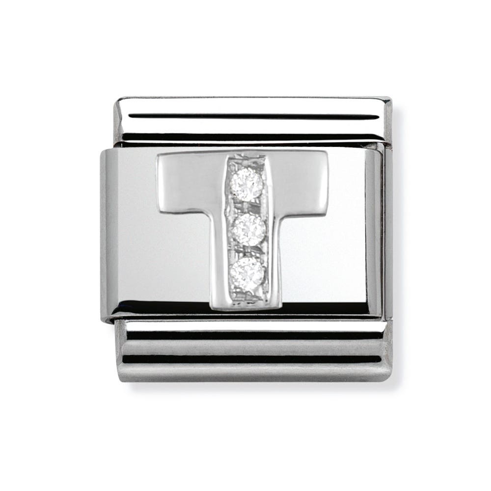 Original Alphabet Charm for Nomination's Composable Classic Bracelet with Letter T in stainless steel, sterling silver and Cubic Zirconia. Available Charm versions: A-Z. Made in Italy. Give your initials to the people you love.