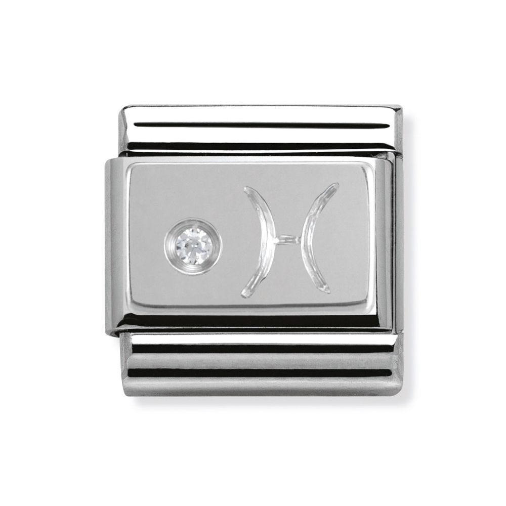 Original Zodiac Charm for Nomination's Composable Classic Bracelet with Pisces symbol in stainless steel, sterling silver and Cubic Zirconia. All Zodiac symbols are available. Made in Italy. Pisces can be enigmatic and sometimes unreadable; complex and intriguing.
