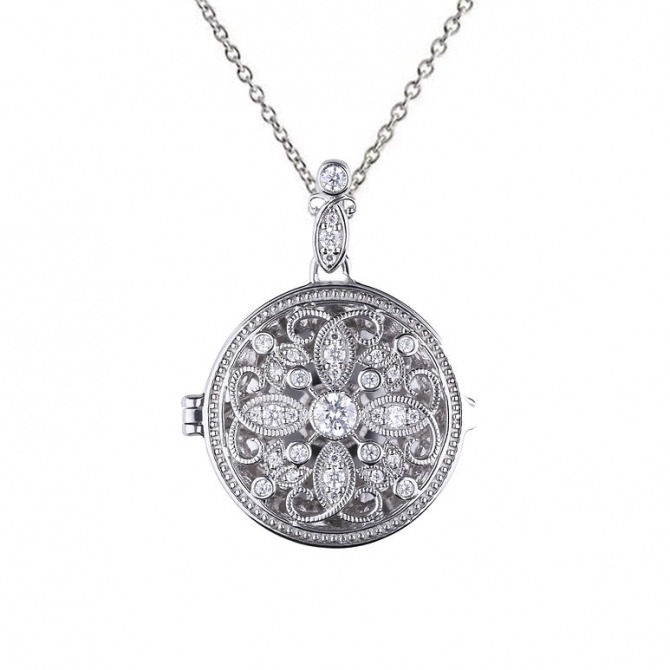 This intricate round filligree locket is unique and a stunning addition to complete any outfit. Featuring Diamonfire cubic zirconia stones which are each cut and polished to mirror the brilliance of a genuine diamond. The product also is made from sterling silver with a triple plated finish of palladium, platinum and rhodium for an almost life-long tarnish protection.