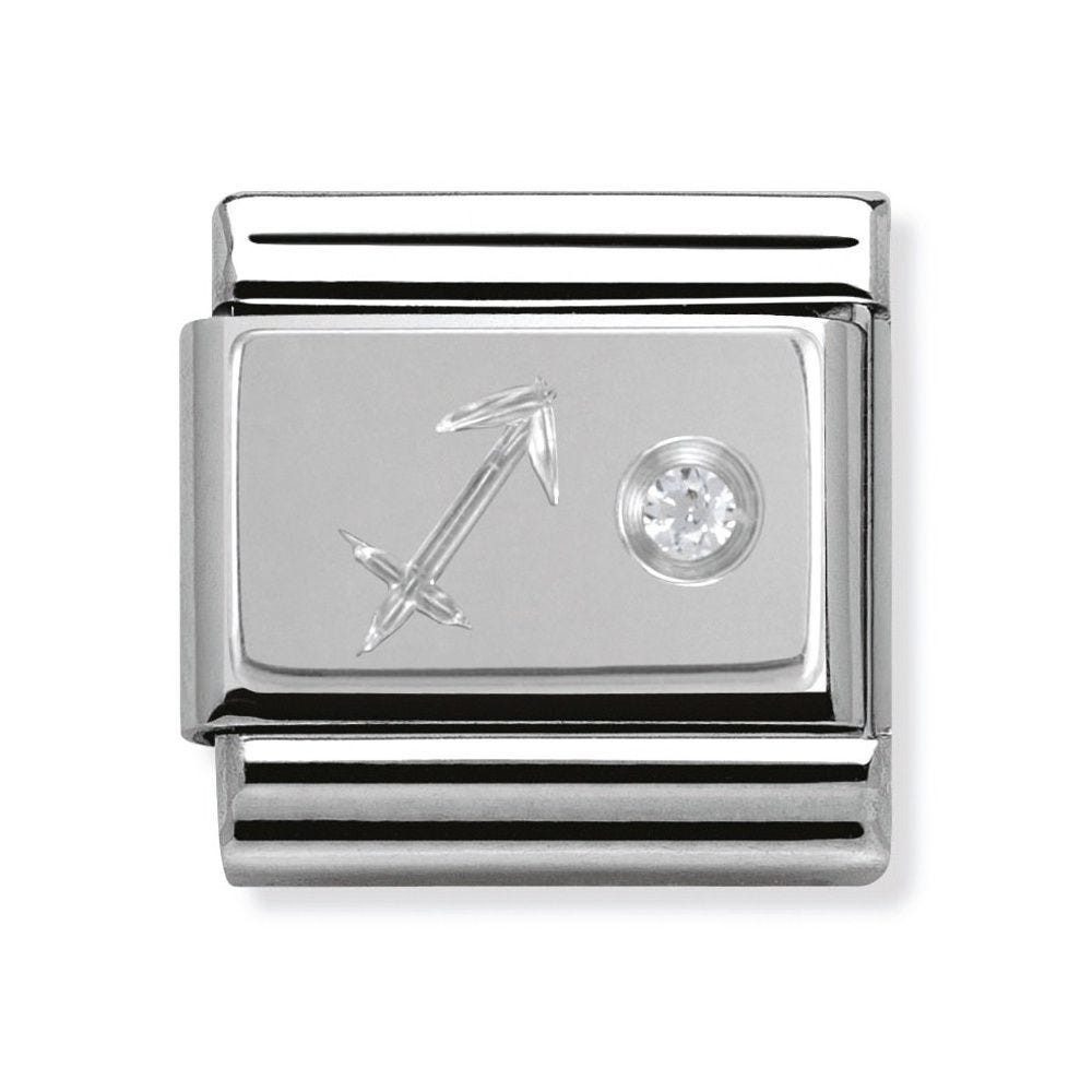 Original Zodiac Charm for Nomination's Composable Classic Bracelet with Sagittarius symbol in stainless steel, sterling silver and Cubic Zirconia. All Zodiac symbols are available. Made in Italy. Sagittarius' element is fire. They have a strong character and they're generous.