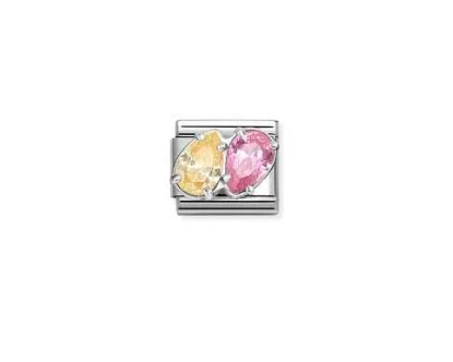 Elevate your Nomination Composable Classic bracelet with the Double Stone Teardrop Link Charm. Crafted from polished stainless steel and silver, this charm showcases two sparkling pink and yellow teardrop cubic zirconia for a chic, luminous finish. Designed to fit all Composable Classic bracelets and presented in Nomination’s signature packaging, it makes a perfect gift or a sophisticated addition to your own collection.