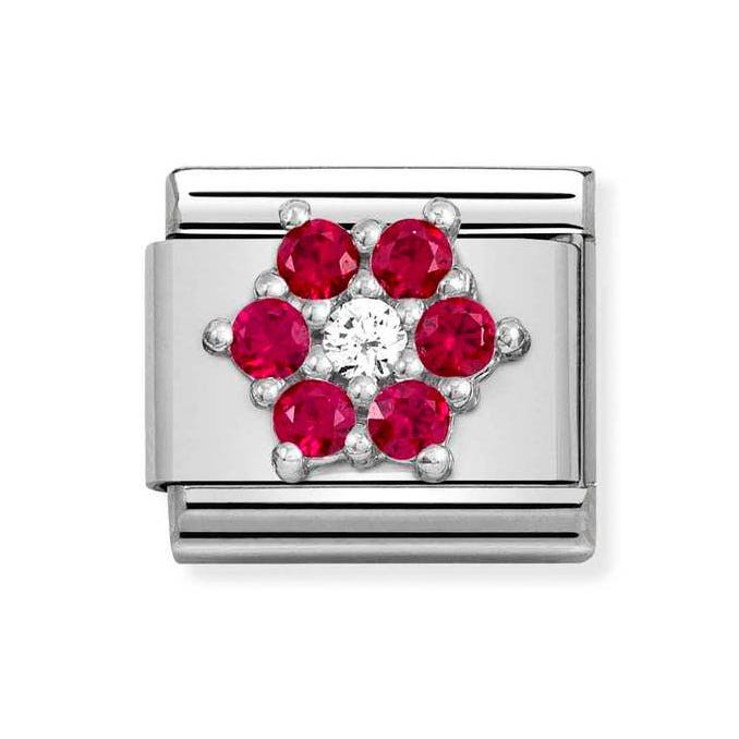 Original Nomination Link for Composable Classic Bracelets in stainless steel with Flower in sterling silver and red and white Cubic Zirconia. Made in Italy. This sparkling flower is available in various colours - discover all the different combinations.