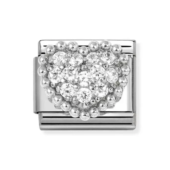 Add a touch of romance and a hint of sparkle to your Nomination Composable Classic bracelet with the White Dot Heart Link Charm. Featuring a beautifully detailed heart design adorned with beaded accents and shimmering cubic zirconia stones, this charm is a radiant addition to any jewellery collection. Crafted with precision from stainless steel and silver, it combines timeless elegance with lasting durability. Part of the Nomination Composable Classic collection.