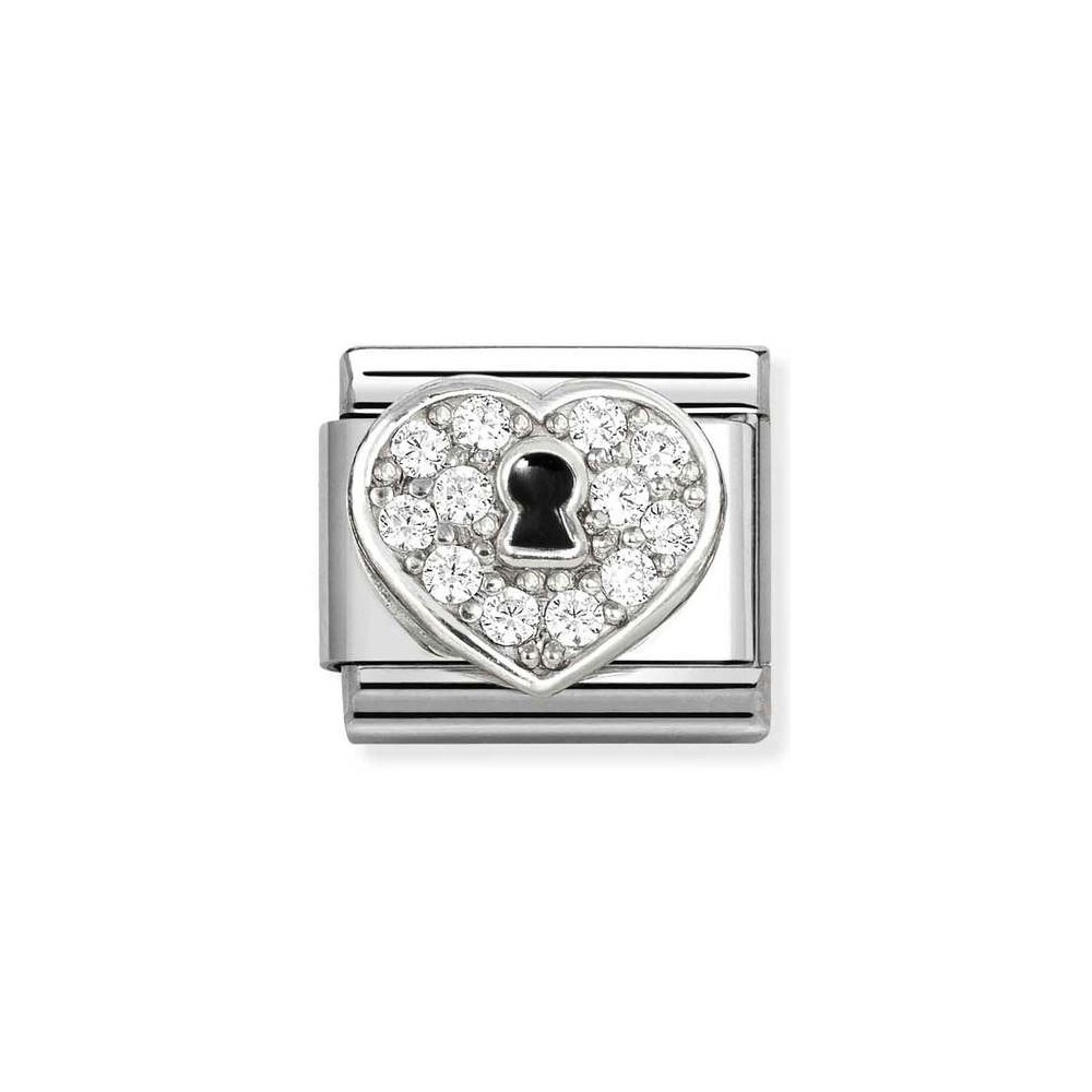 Lock up your love and add a touch of sparkle to your Nomination Composable Classic bracelet with the White Heart Padlock Link Charm. Featuring a beautifully detailed heart design adorned with shimmering cubic zirconia stones and a black enamel keyhole centre, this charm is a radiant addition to any jewellery collection. Crafted with precision from stainless steel and silver and part of the Nomination Composable Classic collection.