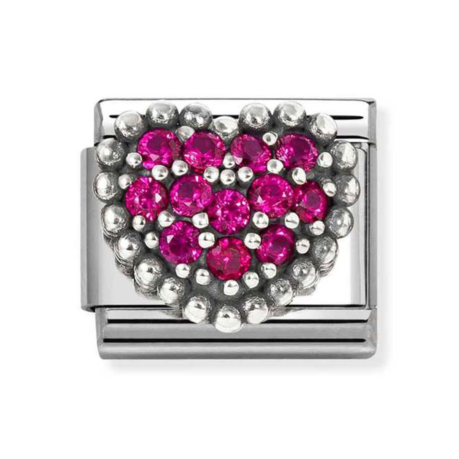 Add a touch of romance and a hint of sparkle to your Nomination Composable Classic bracelet with the Red Dot Heart Link Charm. Featuring a beautifully detailed heart design adorned with beaded accents and shimmering cubic zirconia stones, this charm is a radiant addition to any jewellery collection. Crafted with precision from stainless steel and silver, it combines timeless elegance with lasting durability. Part of the Nomination Composable Classic collection.