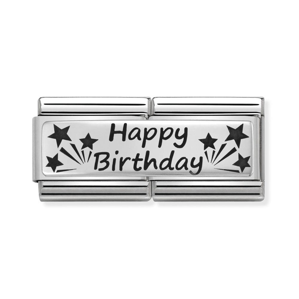 Original Charm for Nomination's Composable Classic bracelet in stainless steel and sterling silver with “Happy Birthday” and Stars in black enamel. Made in Italy. Celebrate the birthday of someone you care about with this new Double Charm!