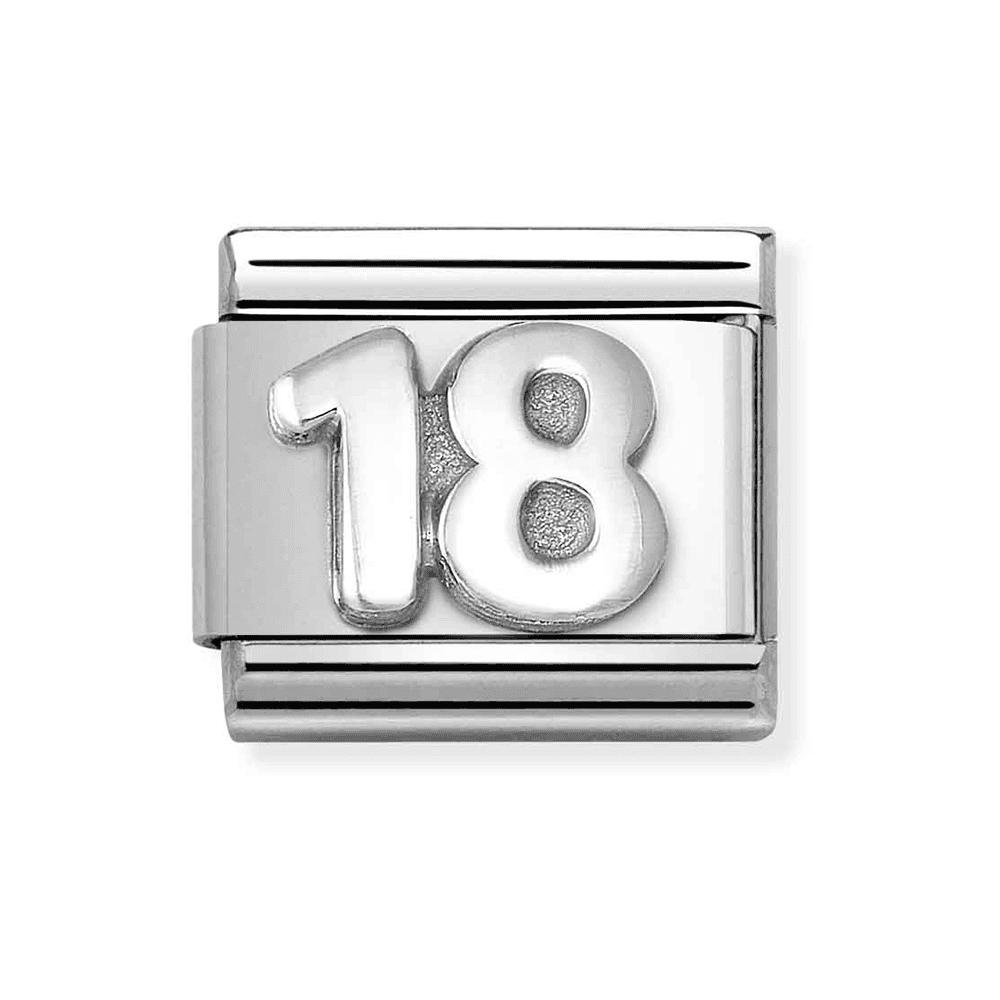Original Nomination Link for Composable Classic Bracelets in stainless steel and sterling silver with oxidised vintage effect with Number 18 symbol. Made in Italy. The Composable Collection adds another dimension to its DNA with the new Silvershine numbers in sterling silver: Genderless and at a very accessible price; lose no time and create your bracelet Link by Link now.