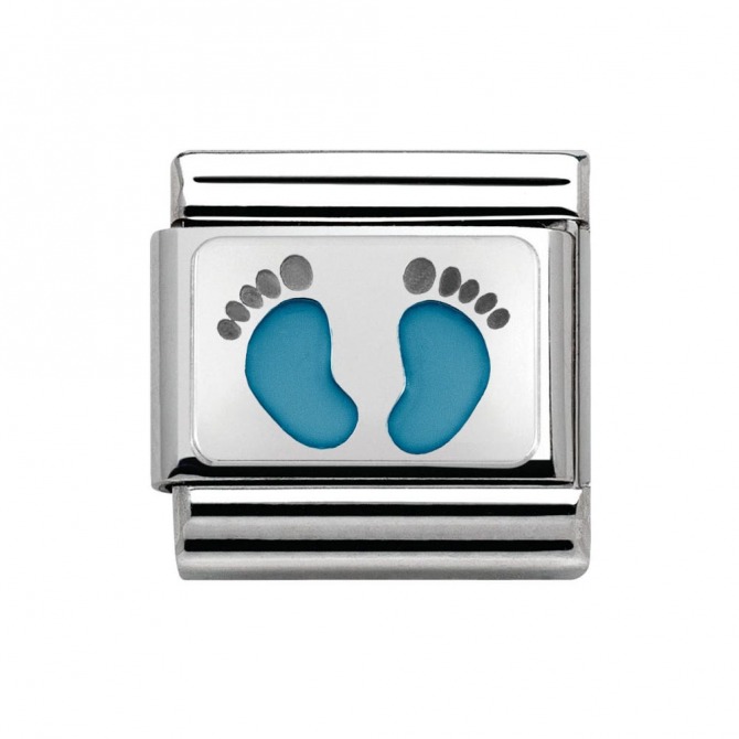 Original Charm for Classic Bracelet with Love symbol in stainless steel, sterling silver and enamel. Charm from the My-Family Composable Collection with light blue Footprint for a newborn baby. Made in Italy. Celebrate your special newborn with a precious Charm.