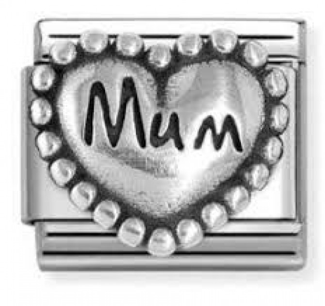 Charm for Original Classic Composable Bracelet in stainless steel and sterling silver with Mum writing on a heart. Charm from the Composable Collection. Made in Italy. Mother's Day is every day. Make her smile!