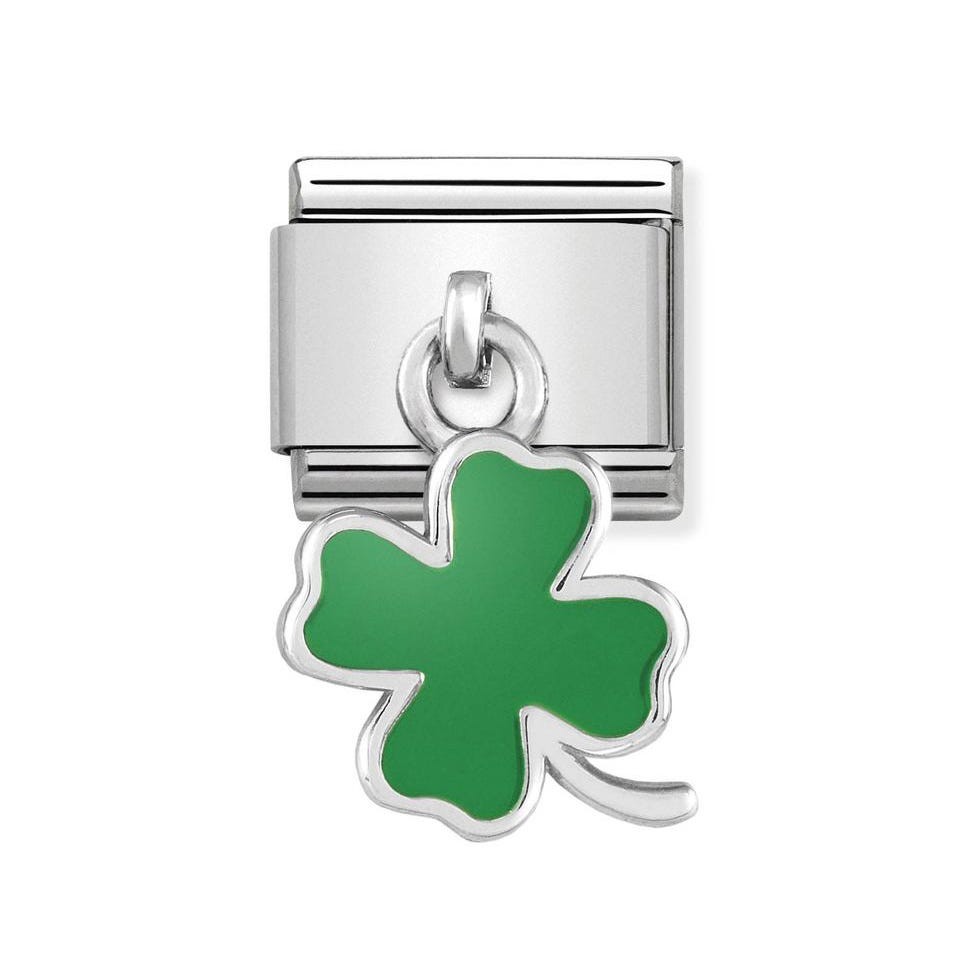 Original Pendant link for bracelet in sterling silver and enamel Green Four-leaf Clover. Made in Italy. This pendant link will bring the wearer good fortune with this green four-leaf clover.