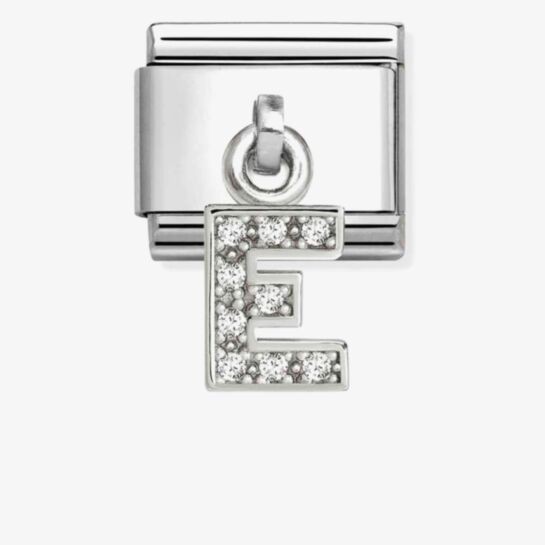 Original Nomination Composable Classic Link for Composable bracelet in stainless steel with silver with White Cubic Zirconia on Letter E Pendant. Wear this Link that is a special accessory that allows you to keep the ones you love near you always.