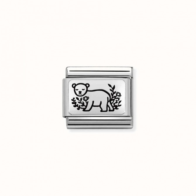 The Bear with Flowers charm features a sterling silver plate with sweet bear motif and a fancy floral design in black enamel detailing which is set on a stainless-steel base.