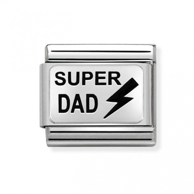 Charm for the original Composable Classic bracelet in stainless steel with Super Dad written and a Lightning Bolt in sterling silver and black enamel. Made in Italy. Give this Charm to your amazing dad! #oneformeoneforyou Would make a wonderful Father's Day gift.