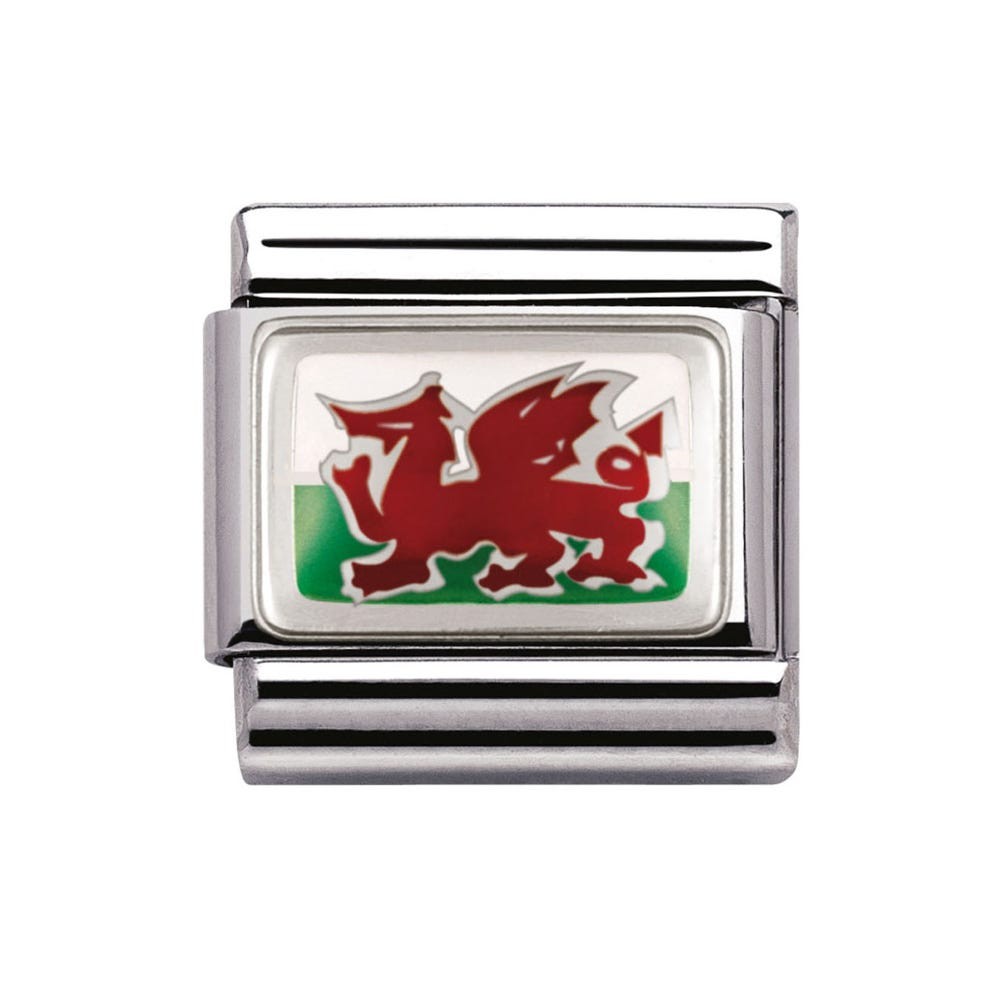 Original Charm in stainless steel, sterling silver and enamel for Nomination's Composable Classic Bracelet with symbol of Wales Flag. Made in Italy. Carry your travels with you always.