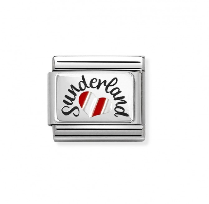 Original Nomination Link, for Composable Classic bracelet, in stainless steel with sterling silver plate & text SUNDERLAND and Heart symbol with red and white enamel stripes. Made in Italy. Choose this Link to keep the team of your city always in your heart.