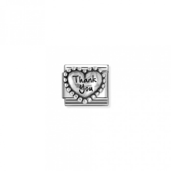 Charm for Original Classic Composable Bracelet in stainless steel and sterling silver with Thank You writing on a heart. Charm from the Composable Collection. Made in Italy.