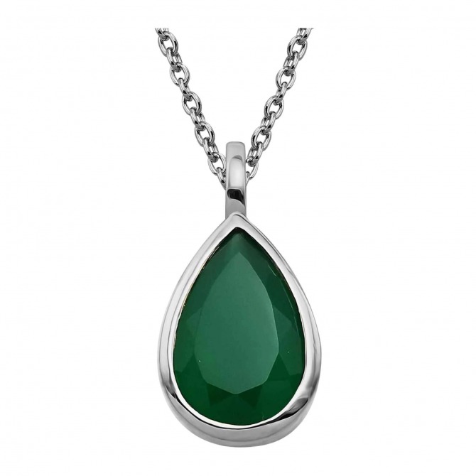 Sterling silver teardrop shaped pendant set with green onyx, suspended from a 18" sterling silver chain.