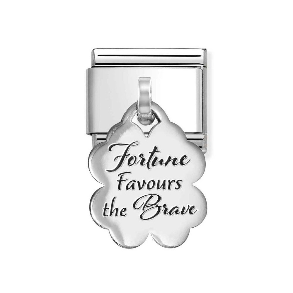 Original Nomination Composable Classic Pendant Link for Composable bracelet in stainless steel with sterling silver Four-Leaf Clover pendant with FAVOURS THE BRAVE in Black engraving. Wear this good luck symbol every day. This Link was designed to accompany you through your days and nights with hope and positivity. This LInk is perfect for someone looking for a motivational talisman or reminder to give their best every day.