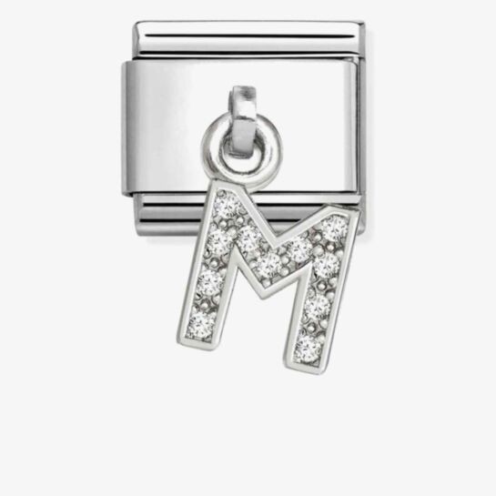 Original Nomination Composable Classic Link for Composable bracelet in stainless steel with silver with White Cubic Zirconia on Letter M Pendant. Keep someone dear to you with you always.