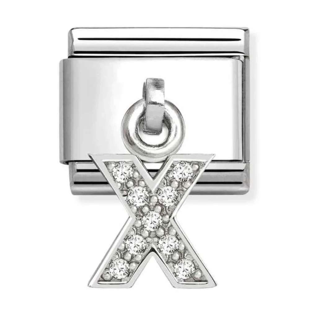 Original Nomination Composable Classic Link for Composable bracelet in stainless steel with silver with White Cubic Zirconia on Letter X Pendant. Tell your story with our new Alphabet pendant Links.