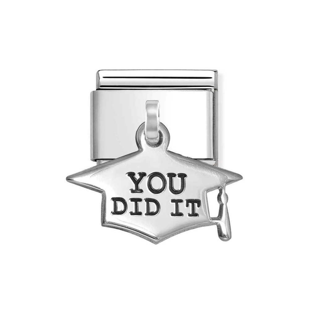 Original Nomination Composable Classic Pendant Link for Composable bracelet in stainless steel with sterling silver Graduation Hat pendant with YOU DID IT! in Black engraving. Despite all the hard work, the continuous challenges and hurdles along the way, now is the moment to focus on one thing and one thing only: You did it! Now take a breath, enjoy the view from up here and give yourself a part on the back. This Link makes a perfect gift for you or someone else who has reached this milestone.
