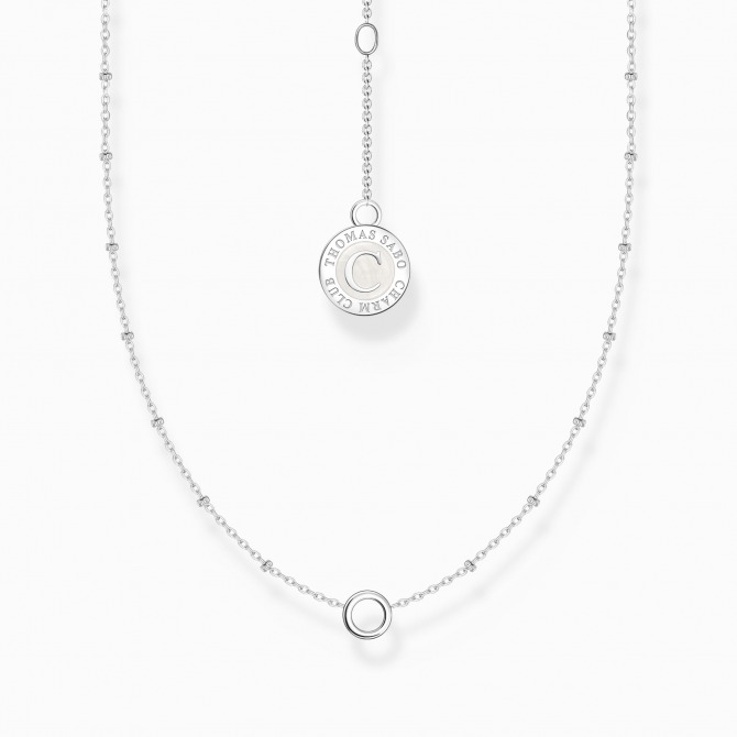 Charm carrier: the delicate charm necklace is made of high-quality 925 Sterling silver and adorned with little balls. The middle is embellished by a round pendant where you can hook on charm pendants as you like. The chain’s end is embellished by a round THOMAS SABO Charm Club Charmista Coin with hand-painted white cold enamel. The necklace’s length can be adjusted from 40 to 45 cm.