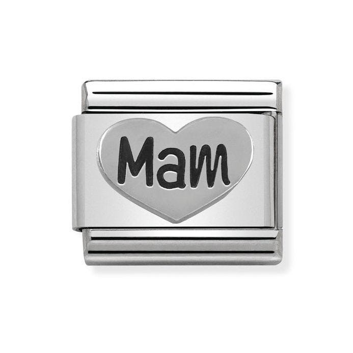 Nomination classic stainless steel composable link from the Family Collection. The Mam Heart charm made of stainless steel with 925 sterling silver and black enamel. The perfect Mother's Day gift.
