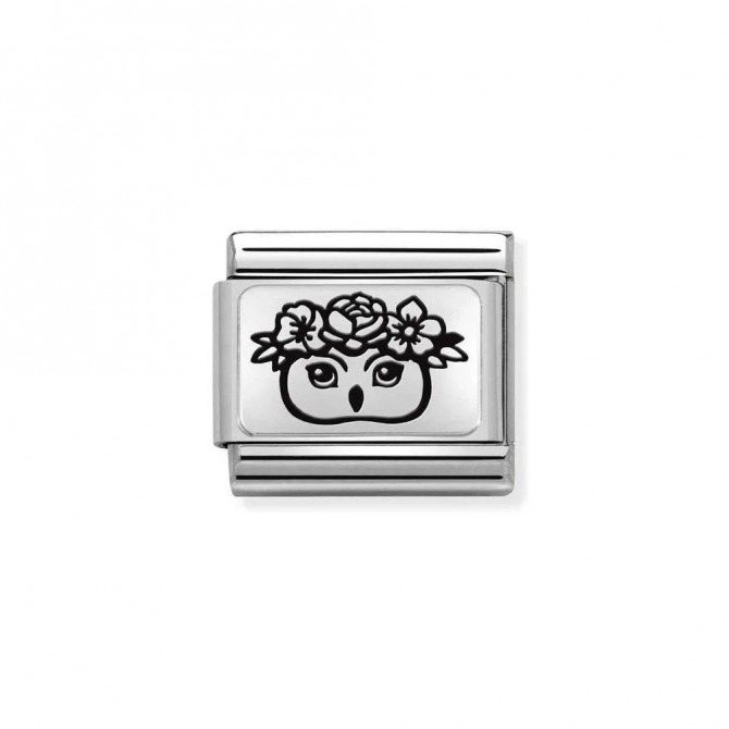 The Owl with Flowers Charm features a sterling silver plate with a sweet owl motif and a fancy floral design in black enamel detailing which is set on a stainless-steel base.