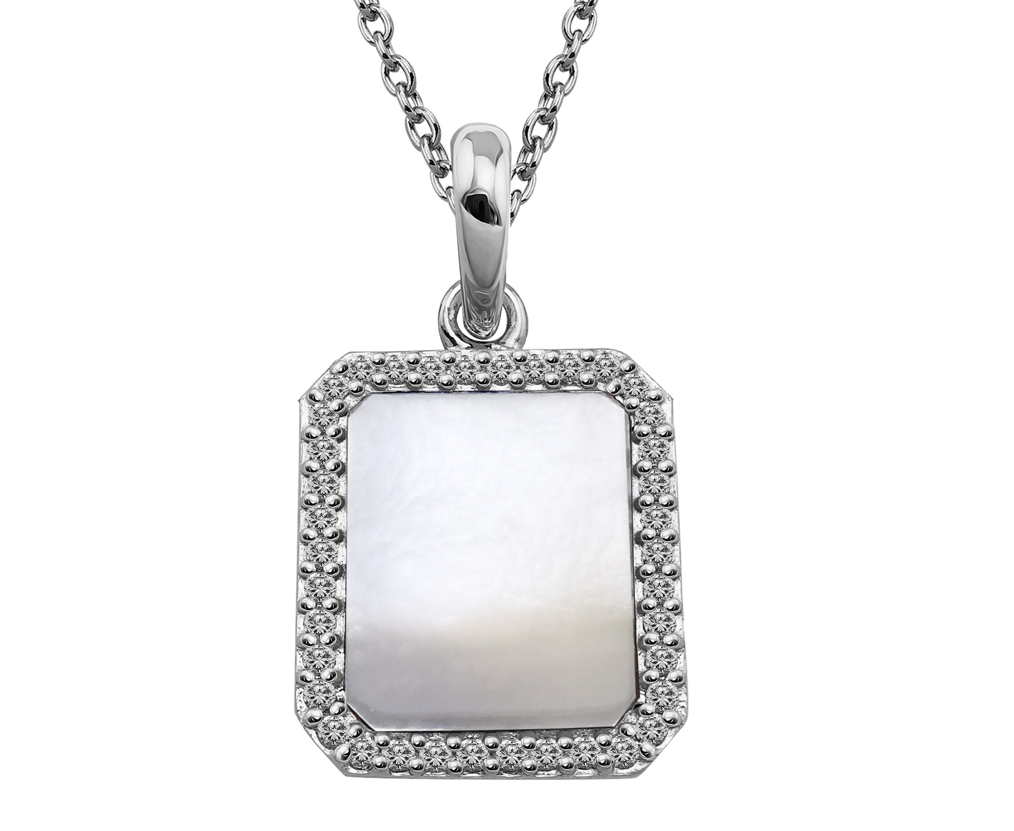 Sterling silver rectangular pendant set with Mother of Pearl and cubic zirconia, suspended on an 18" sterling silver chain.
