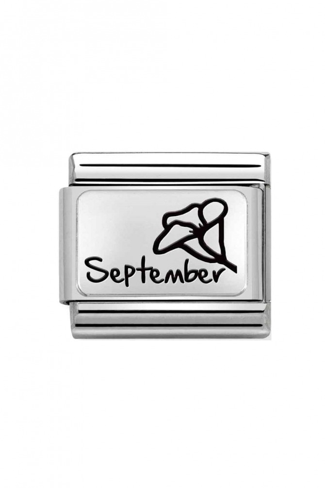 Original Nomination Link for Composable Classic Bracelets in stainless steel and sterling silver with SEPTEMBER text and Morning Glory, a flower of the month symbol in Black engraving. Made in Italy. Celebrate a birthday or anniversary with this special Link.