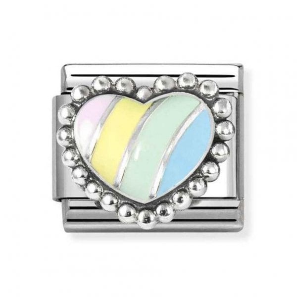 Original Nomination Composable Classic Link for Composable bracelet in stainless steel with raised sterling silver Pastel Stripe beaded Heart with coloured enamel. Add some colour to your everyday look. This Link makes the perfect gift to add to the bracelet of someone you love.