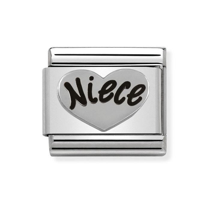 Original Charm for the Nomination Composable classic bracelet in sterling silver and enamel with “Niece” written. Made in Italy. Create your bracelet and dedicate each Charm to an important member of your family.