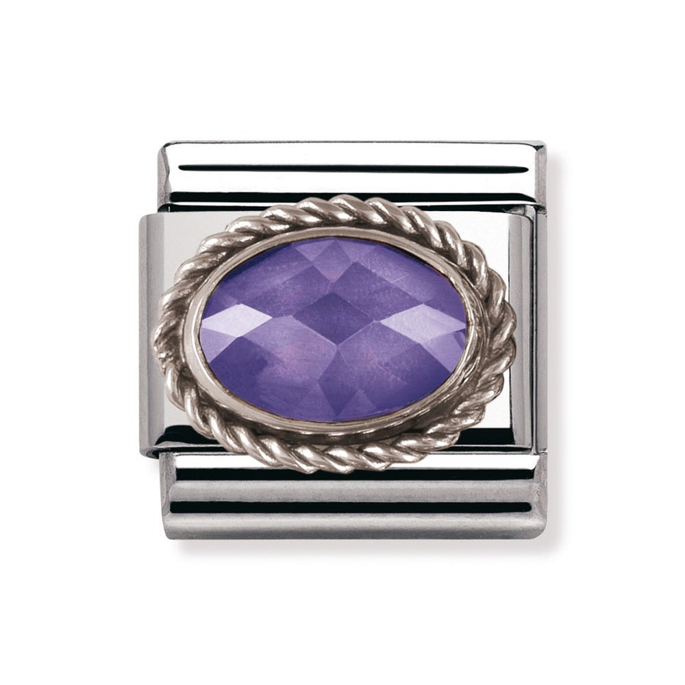 Nomination composable classic stones collection stainless steel with twisted sterling silver and violet oval faceted cubic zirconia charm. Ideal as a February Birthday gift.