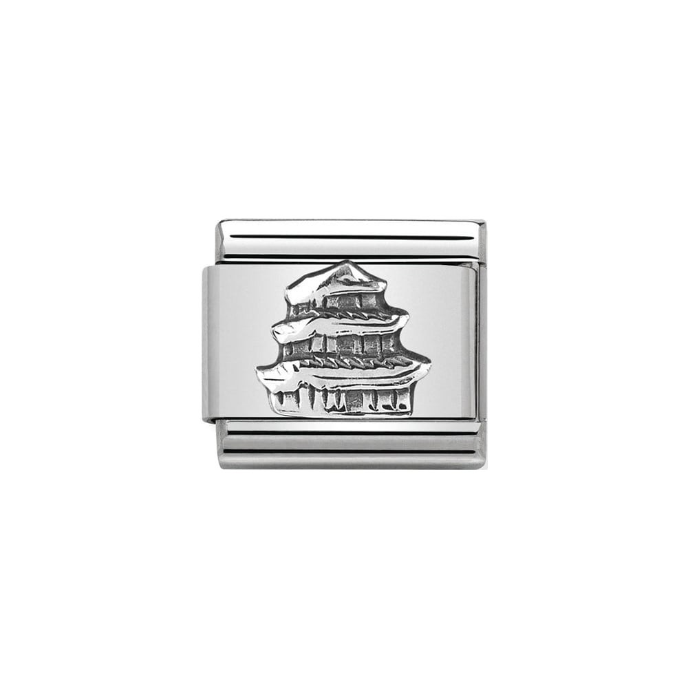 Original Charm for Composable Classic Bracelet in stainless steel and sterling silver. Symbol of Pagoda in relief. Made in Italy. Charm from the “Around the World” Composable Collection. The perfect gift for travel lovers.