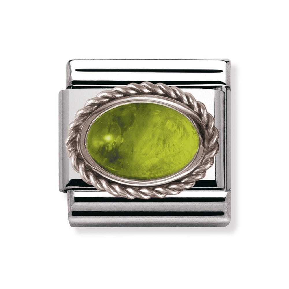 Original Charm for Nomination's Composable Classic Bracelet in stainless steel, sterling silver and Peridot. Also available in other coloured stones. Made in Italy. August Birthstone is peridot (also known as olivine), which gives security to those who wears it. Treat yourself or a loved one with a special birthday charm.