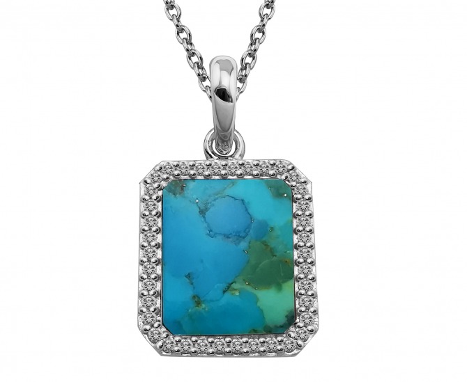 Sterling silver rectangular pendant set with Mother of Pearl and cubic zirconia, suspended on an 18" sterling silver chain.