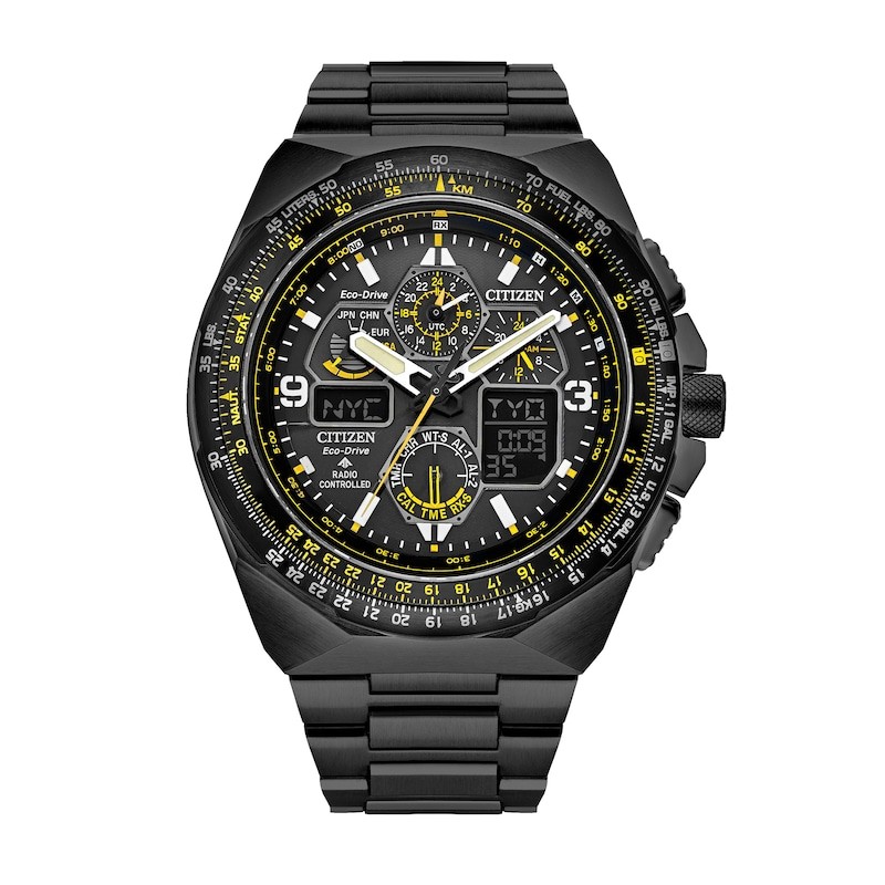 Cutting-edge style that’s ready for any adventure, the Skyhawk A.T keeps incredibly precise time with radio-controlled atomic clock synchronisation technology. Styled with a black ion-plated stainless-steel bracelet & black dial with yellow accents for a polished look that’s finished with anti-reflective sapphire crystal. Ready for wherever life takes you, this timepiece also features a 1/100 second chronograph that measures up to 24 hours, world time in 43 cities, 12/24 hour time, perpetual calendar, 2 alarms, 99 minute countdown timer, digital display light, dual-time, power reserve indicator, water resistance to 200 metres and our sustainable Eco-Drive technology; powered by light, any light and never needs a battery.