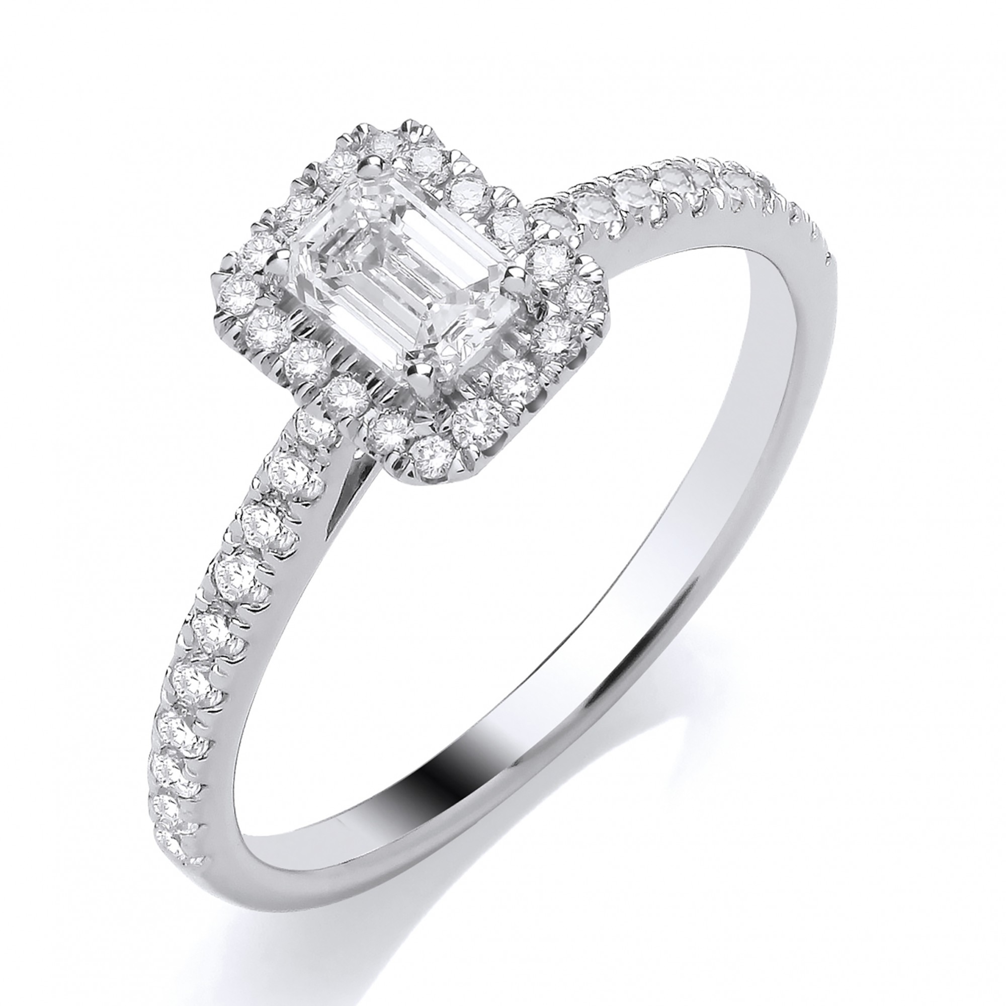 Solitaire Emerald cut lab grown diamond in a halo setting with stone set shoulders, mounted on a 9ct white gold ring. D-E. VS1 0.70ct + 0.30ct..