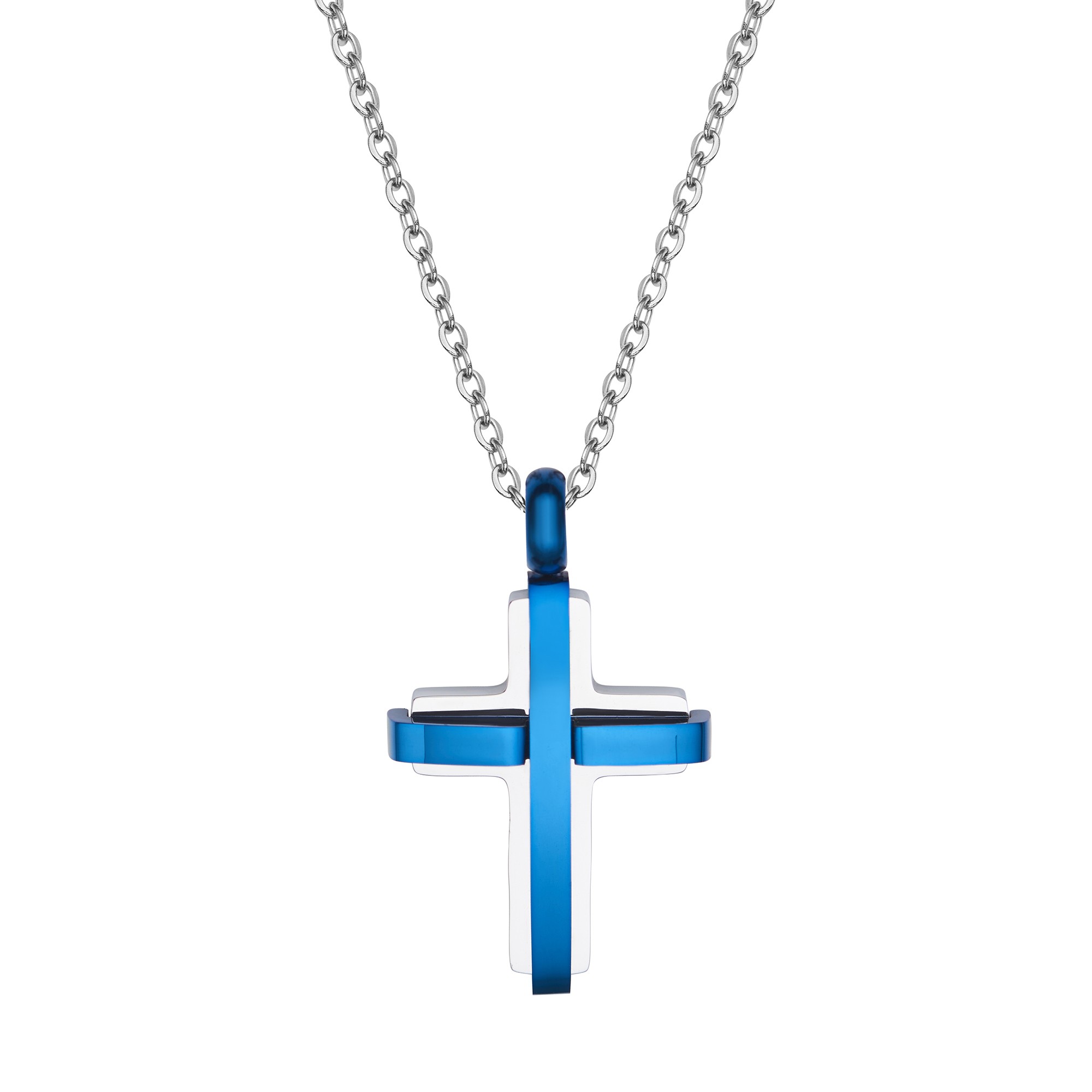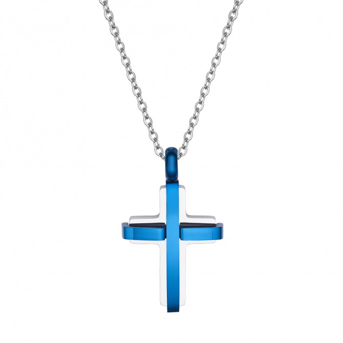 Stainless steel blue cross pendant on a 50cm stainless steel chain.