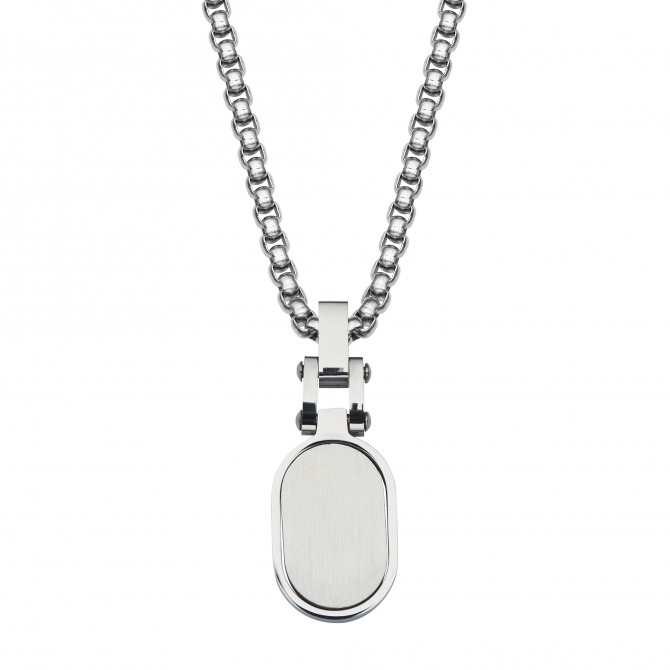 Stainless steel oval disc pendant and chain. The pendant can be engraved, and the chain measures 50cm in length.