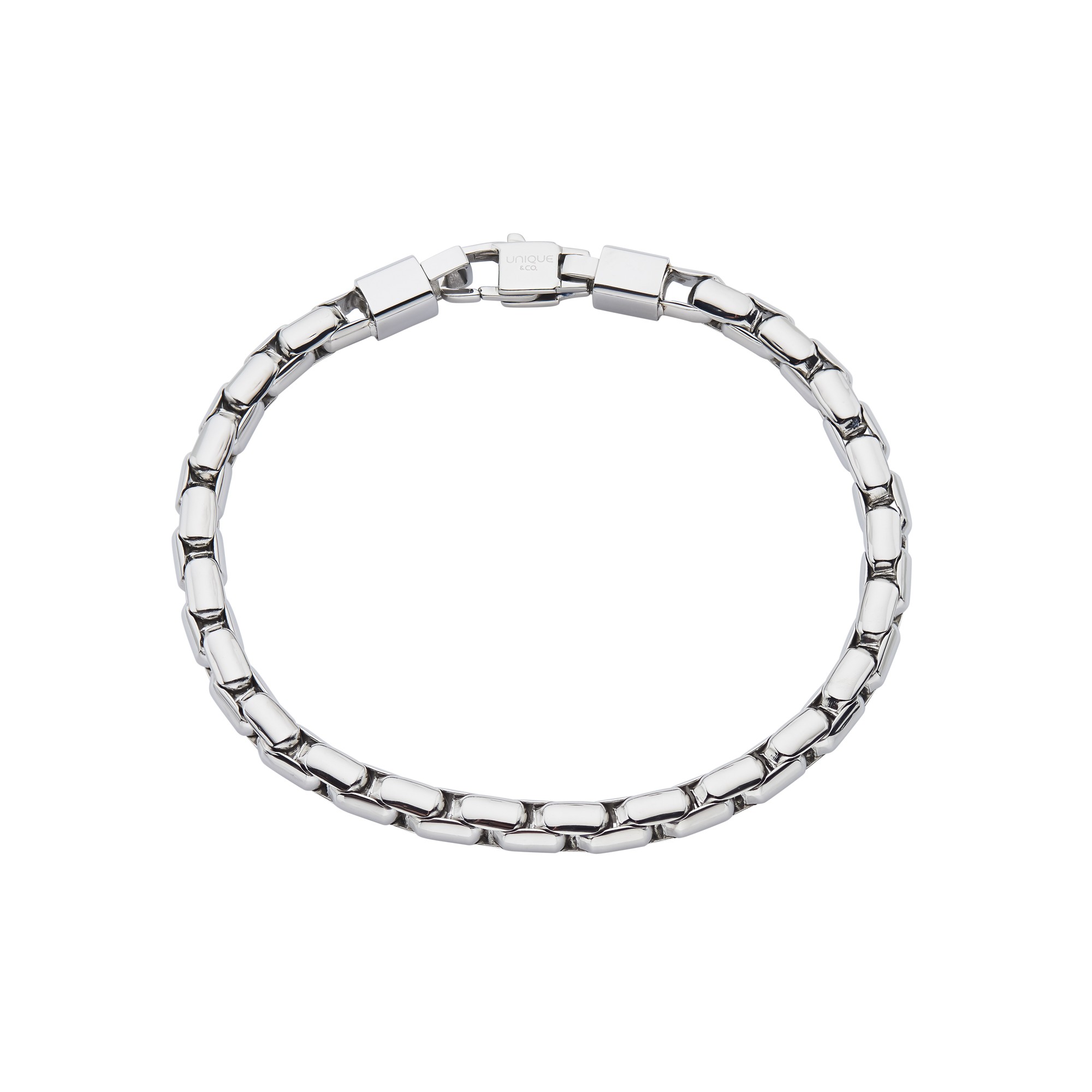 Stainless steel round box bracelet, measures 21cm in length.