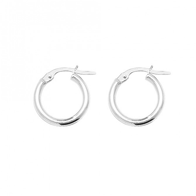 Sterling silver 10mm plain hoop earrings with a hinged fastener.