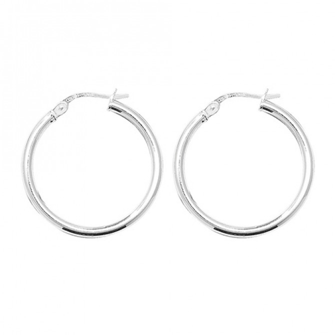 Sterling silver 20mm plain hoop earrings with a hinged fastener.