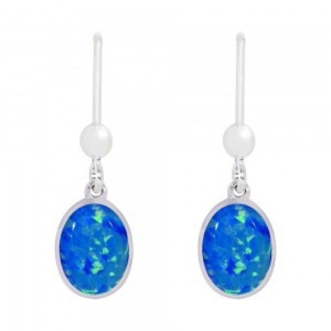 Sterling silver with an 8x6mm oval, rub set synthetic blue opal drop earrings.
