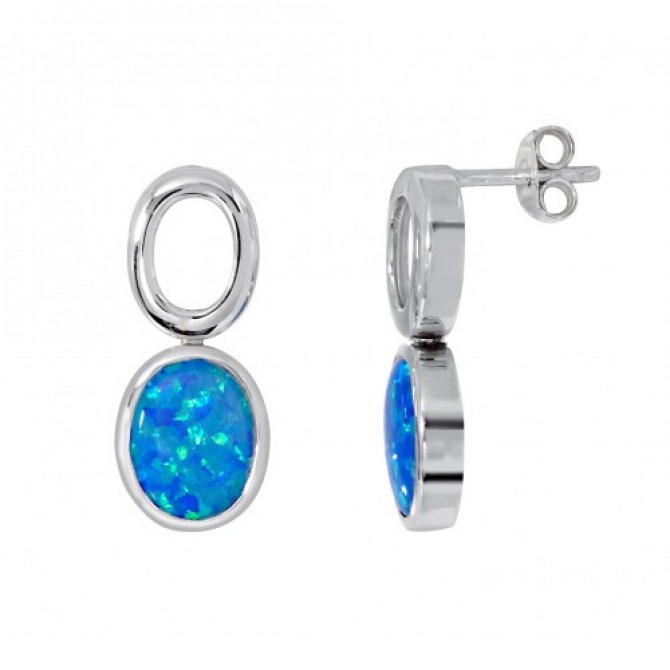 Sterling silver and synthetic blue opal drop earrings.