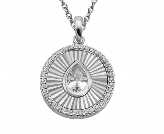 Sterling silver circular pendant set with cubic zirconia suspended from a 18" sterling silver chain.