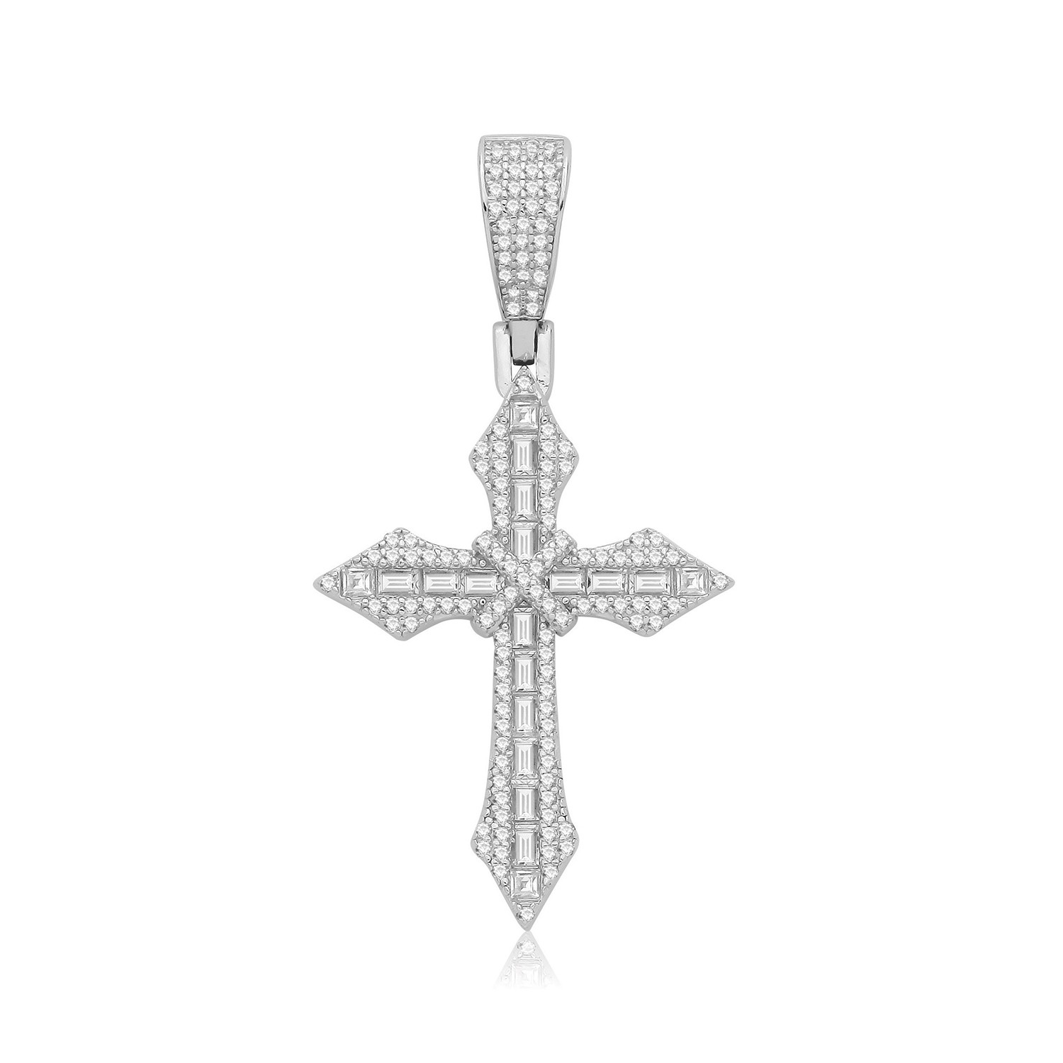 Sterling silver cross pendant set with cubic zirconia.