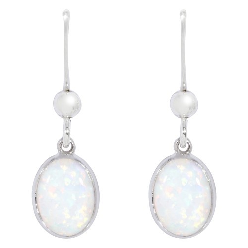 Sterling silver with an 8x6mm oval, rub set synthetic opal drop earrings.