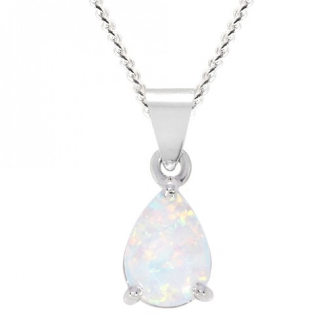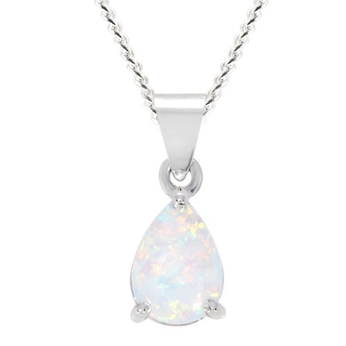 Sterling silver with a pear shaped 8mm x 6mm claw set synthetic opal pendant on an 18" sterling silver chain.