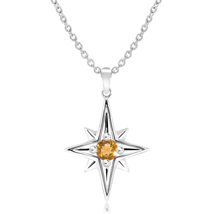 Sterling silver star shaped pendant set with citrine, suspended from an 18" sterling silver chain.